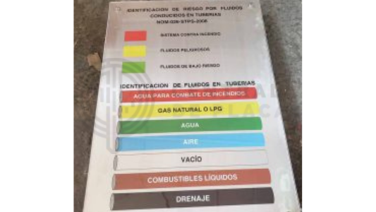 Placa de identificación de fluidos de tubería fabricado en aluminio 3 mm de espesor con protección de acrílico (frente) y 4 sujetadores metálicos para su fijación.